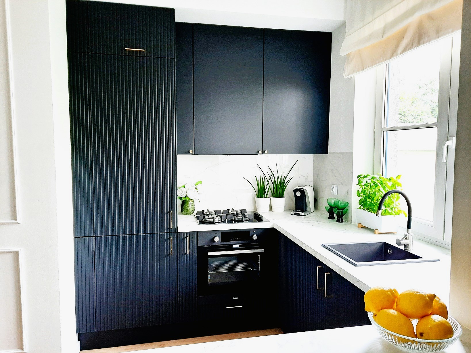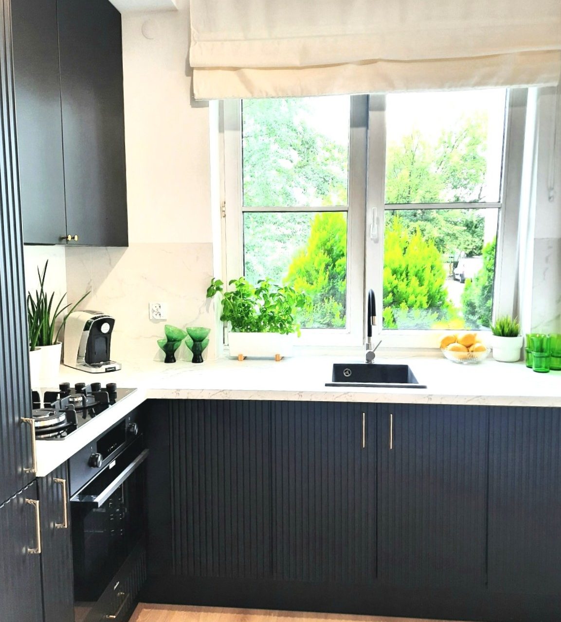 • Widna kuchnia w aneksie – nowoczesne rozwiązanie z długim blatem, barem i przestrzenią na jadalnię.