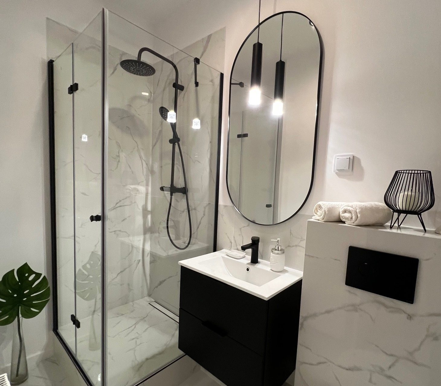 • nowoczesna łazienka z prysznicem, WC oraz miejscem na pralkę i suszarkę,