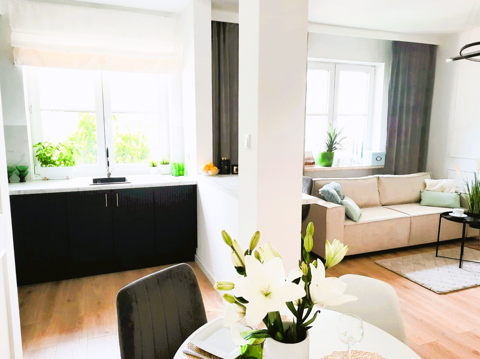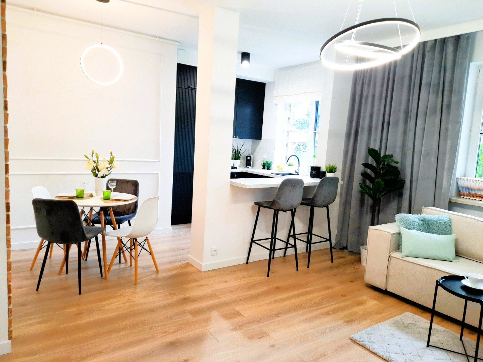 • przestronny salon z kuchnią w aneksie oddzieloną barem i miejscem na jadalnię,