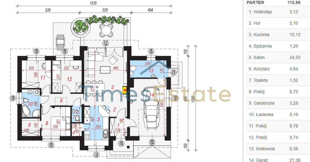 W przytulnym wnętrzu wita nas wygodny salon (ok. 25mkw), z dużym oknem i wyjściem na taras.
