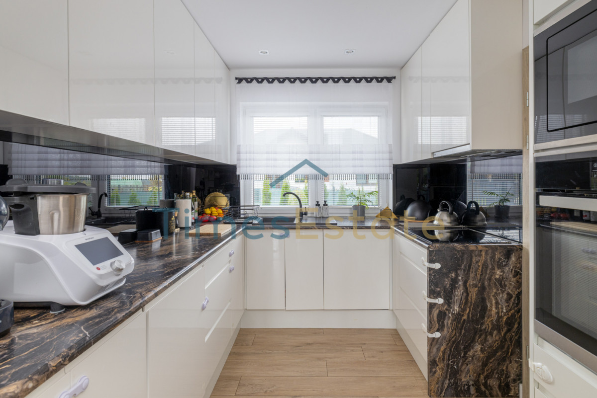 Połączony jest z elegancką, w pełni wyposażoną kuchnią z oknem i spiżarnią.