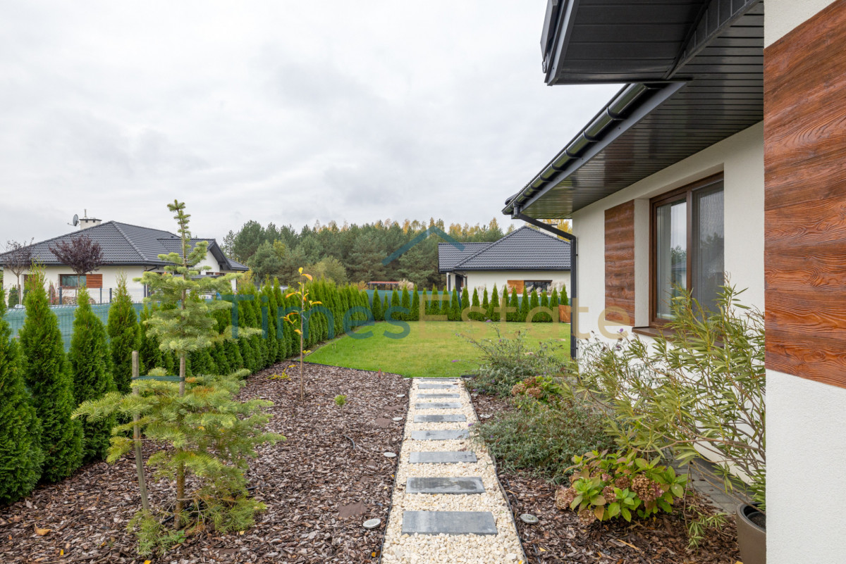 Dom stoi na zadbanej działce, w pobliżu lasu.