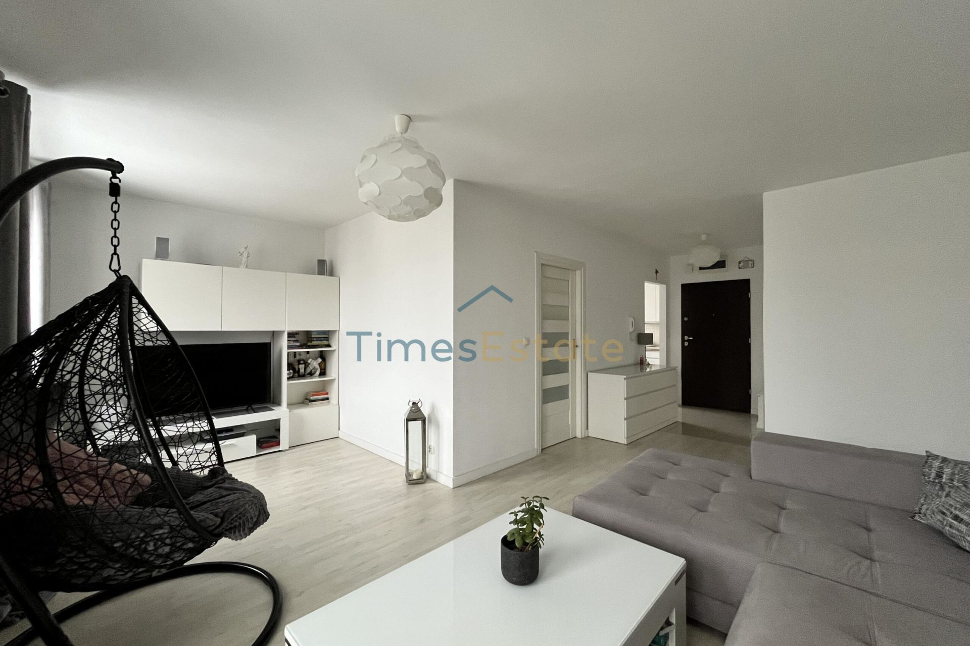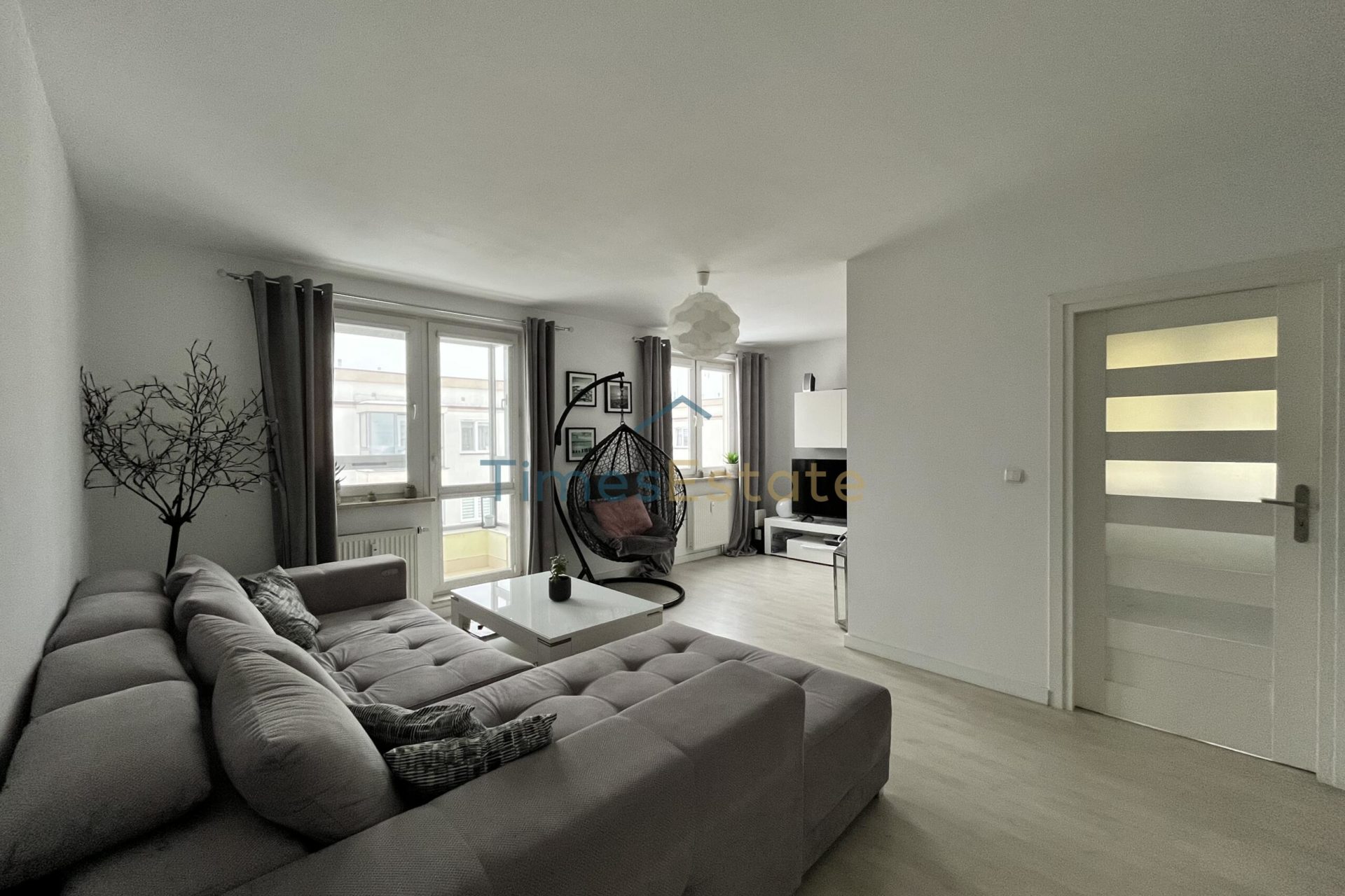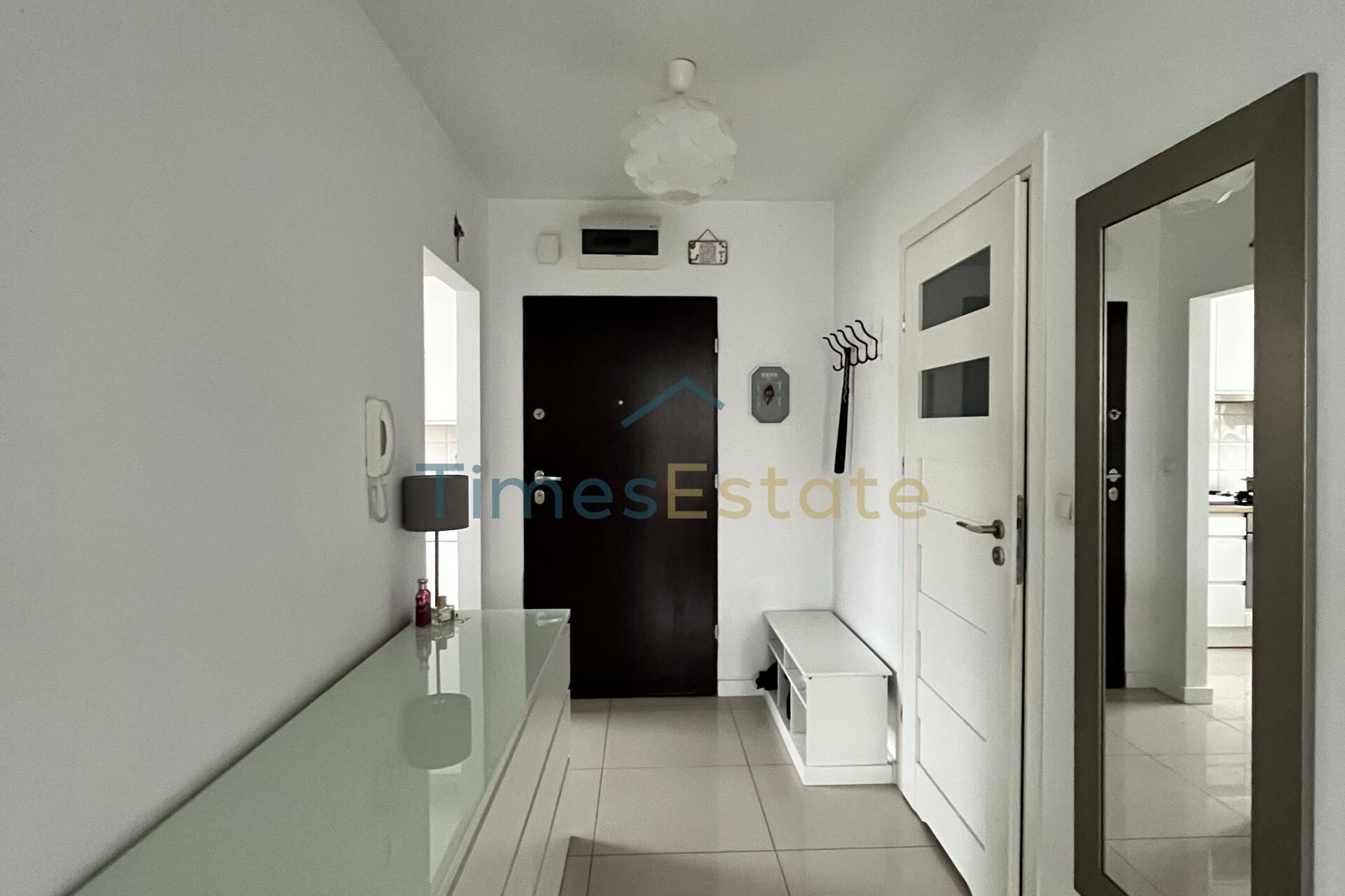 Otwarta przestrzeń łącząca salon z holem, z której jest wyjście na balkon daje poczucie przestrzeni.