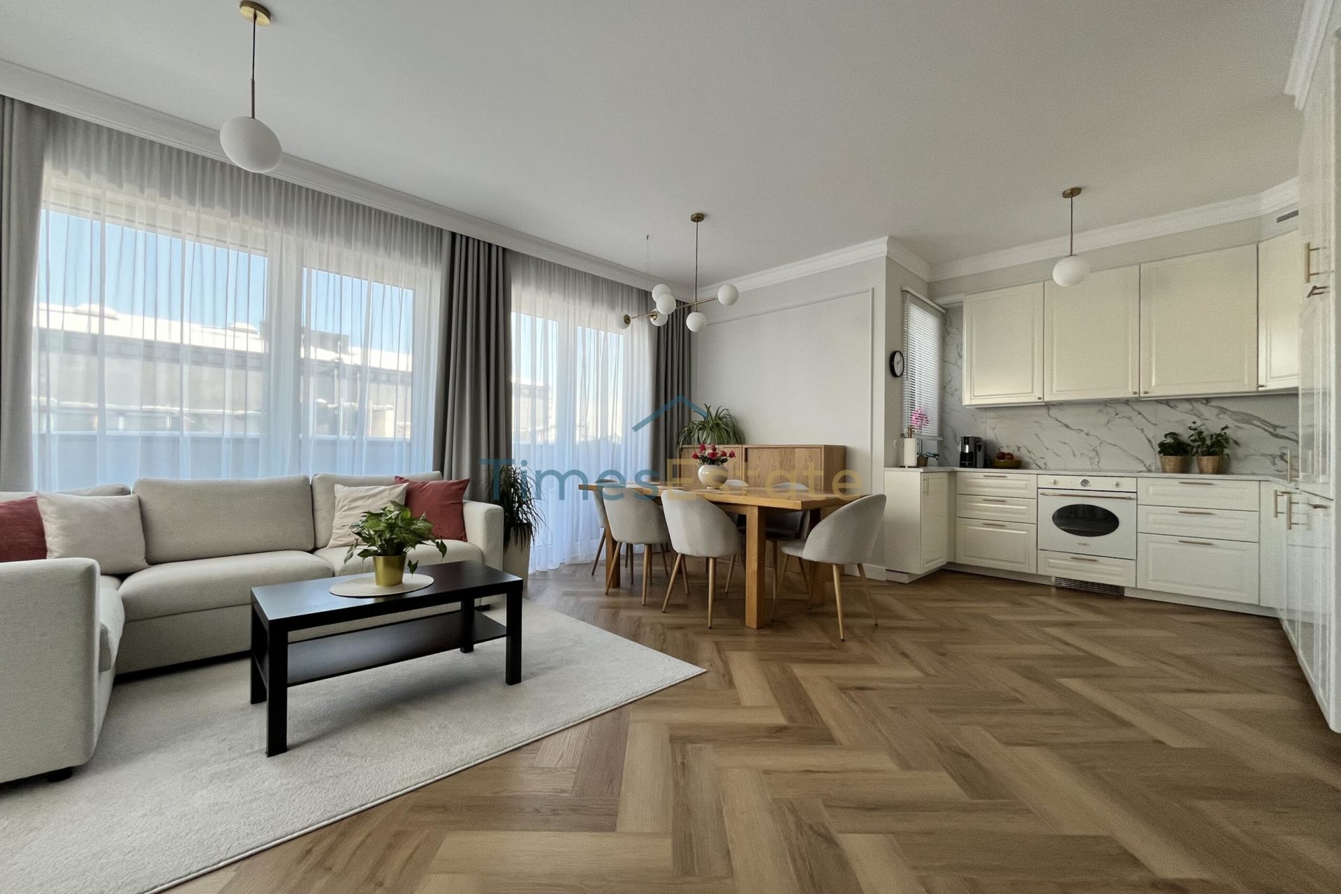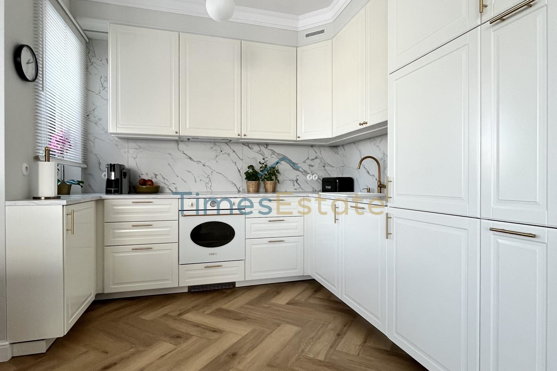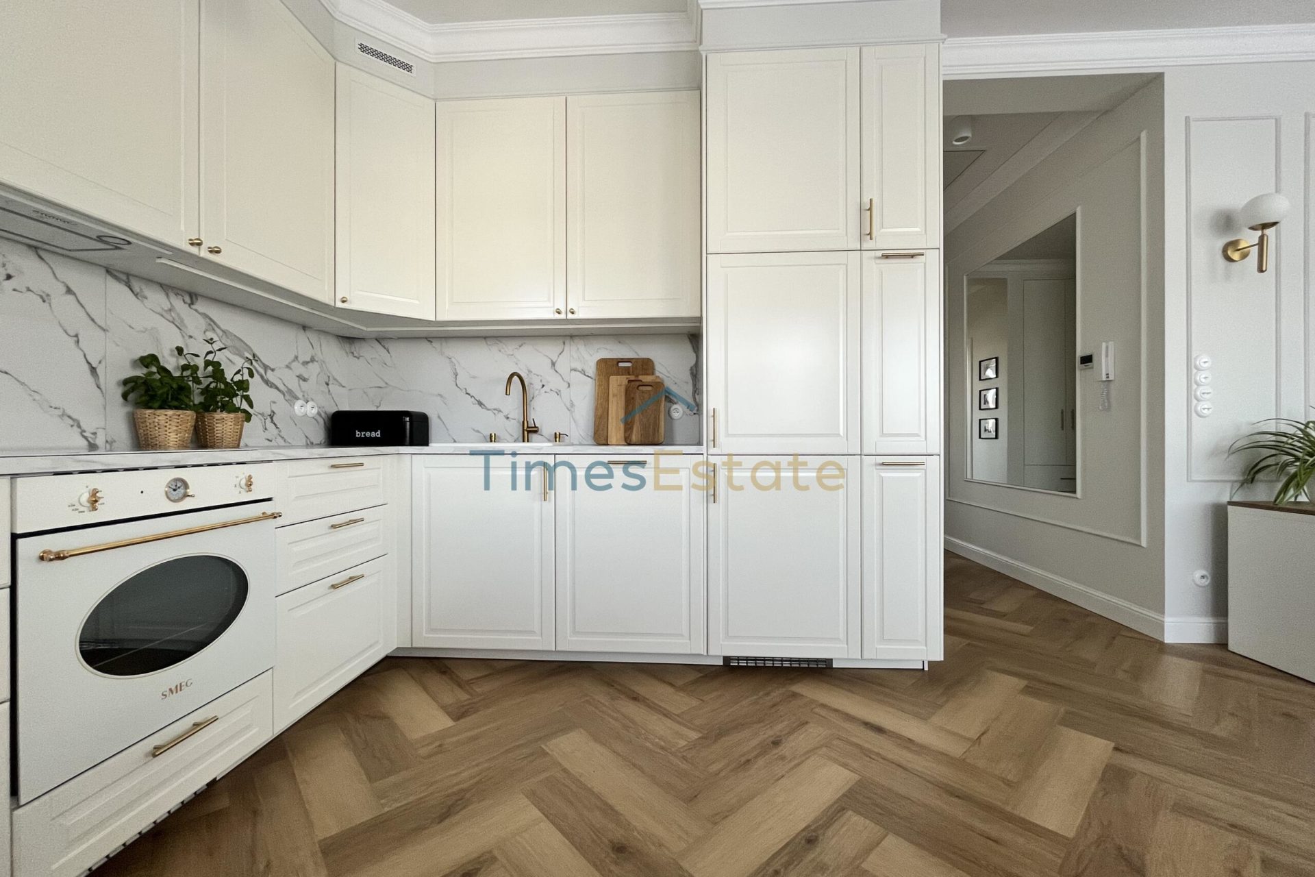 Kuchnia w zabudowie jest w pełni wyposażona, dzięki czemu otwarta przestrzeń jest spójna i elegancka.